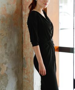 Endless styling options calls for the Cowl Tie Drape Dress that will deliver desk to dinner style. Crafted from a premium stretch jersey fabrication, this dress allows for a comfortable and flexible fit through the torso and body. The fitted silhouette flatters the body without clinging to it and the length sits just on the knee. The adjustable attached tie belt on the sides can be tied a multitude of ways depending on your preference. Tie at the front to drape and flatter the tummy or for a more streamlined look tie at the back. This style is also reversible, wear with the cowl drape at the front, ideal for women with larger bust or wear boat-neck for a higher neckline, ideal for women with smaller bust – meaning the cowl drape will sit at the back but wills till remain bra friendly. Perfect for the office, corporate events and travel.- Premium stretch jersey fabric, easy care, easy wear