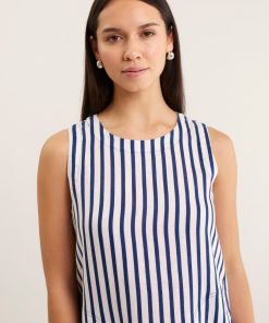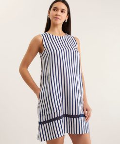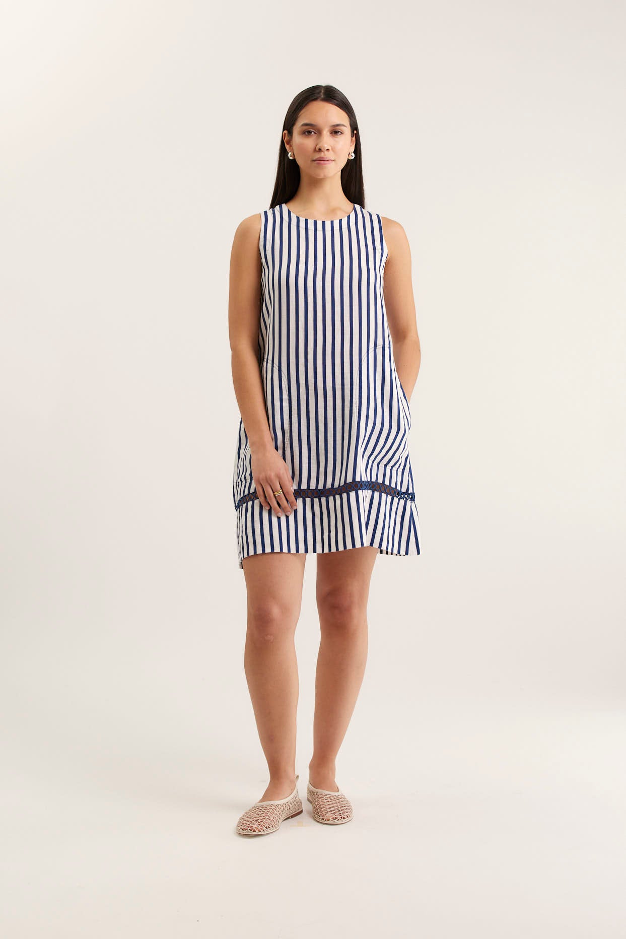 100% Linen Navy/White Breton stripe Sleeveless dress with side pockets Contrast stitching deep hem with lace trim Cold, gentle hand wash
