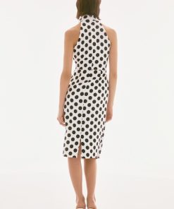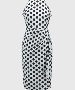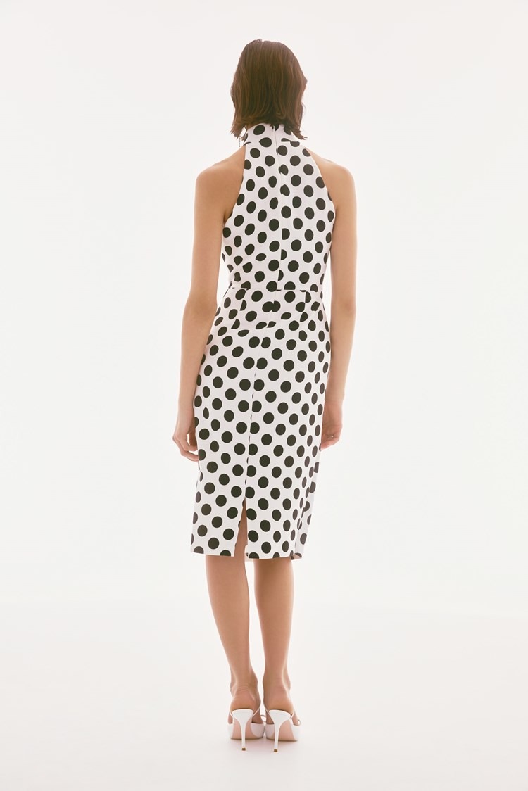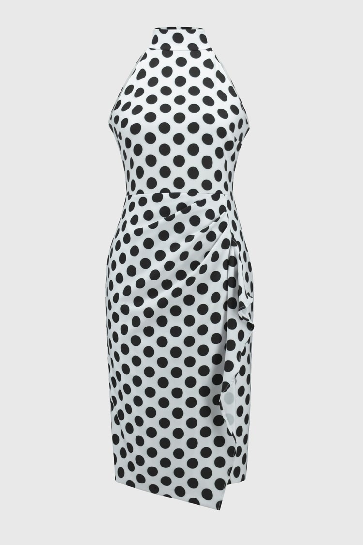 A halter mock neckline, sheath silhouette, and a cascading pleated drape detail come together to create a vivacious look fit for a special soirée. Crafted from a luxurious twill fabric with an alluring dotted print, this dress is sure to mesmerise the crowd. Part of the Signature collection.