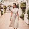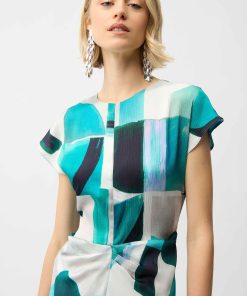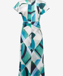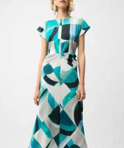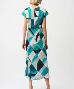 Geometry takes center stage in this textured satin dress, where clean lines meet fluid movement. A scoop neckline leads into short dolman sleeves, while soft pleats shape the waist. A back keyhole and button closure complete the silhouette.