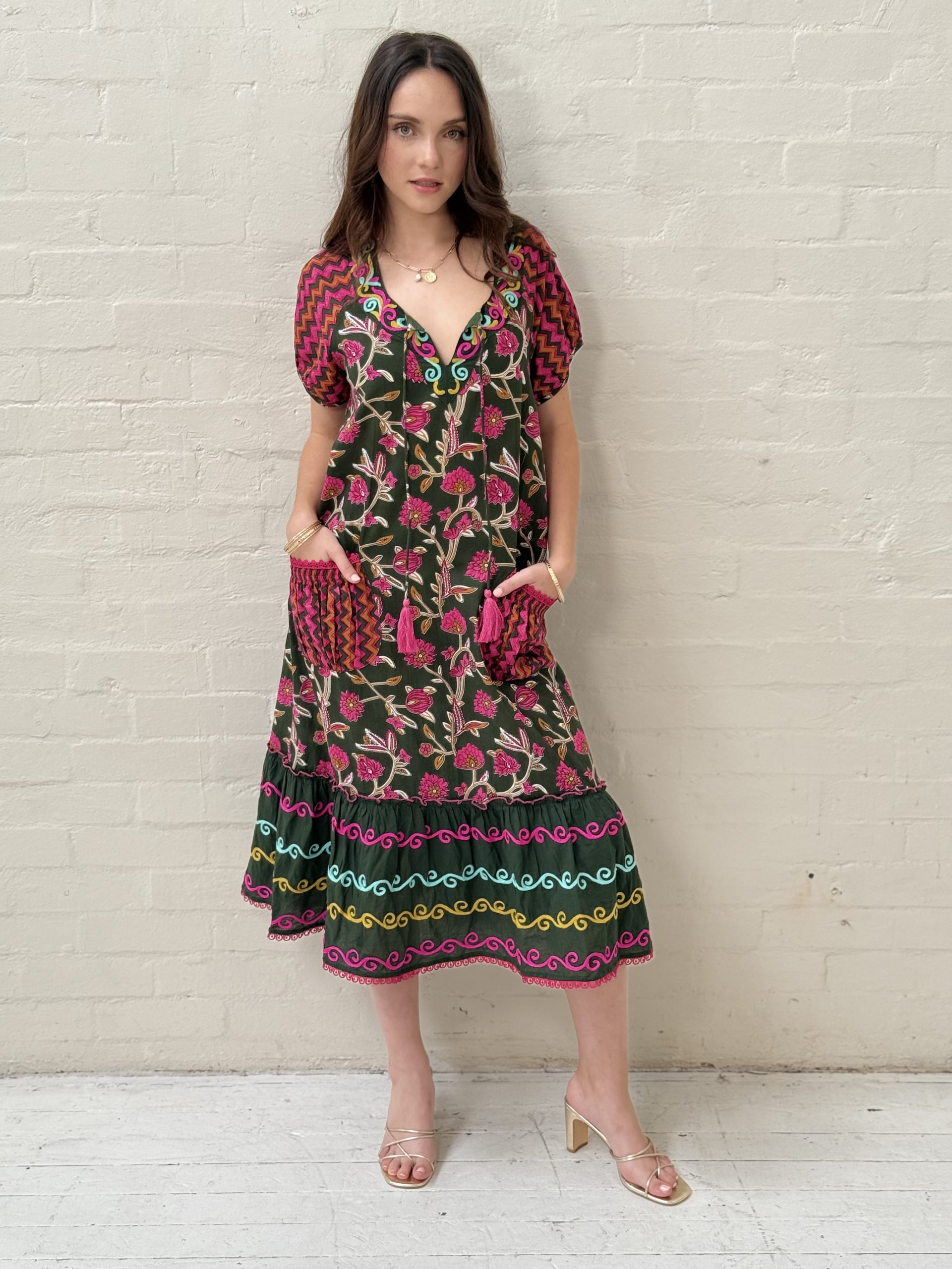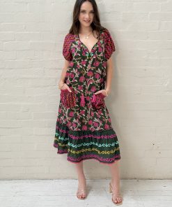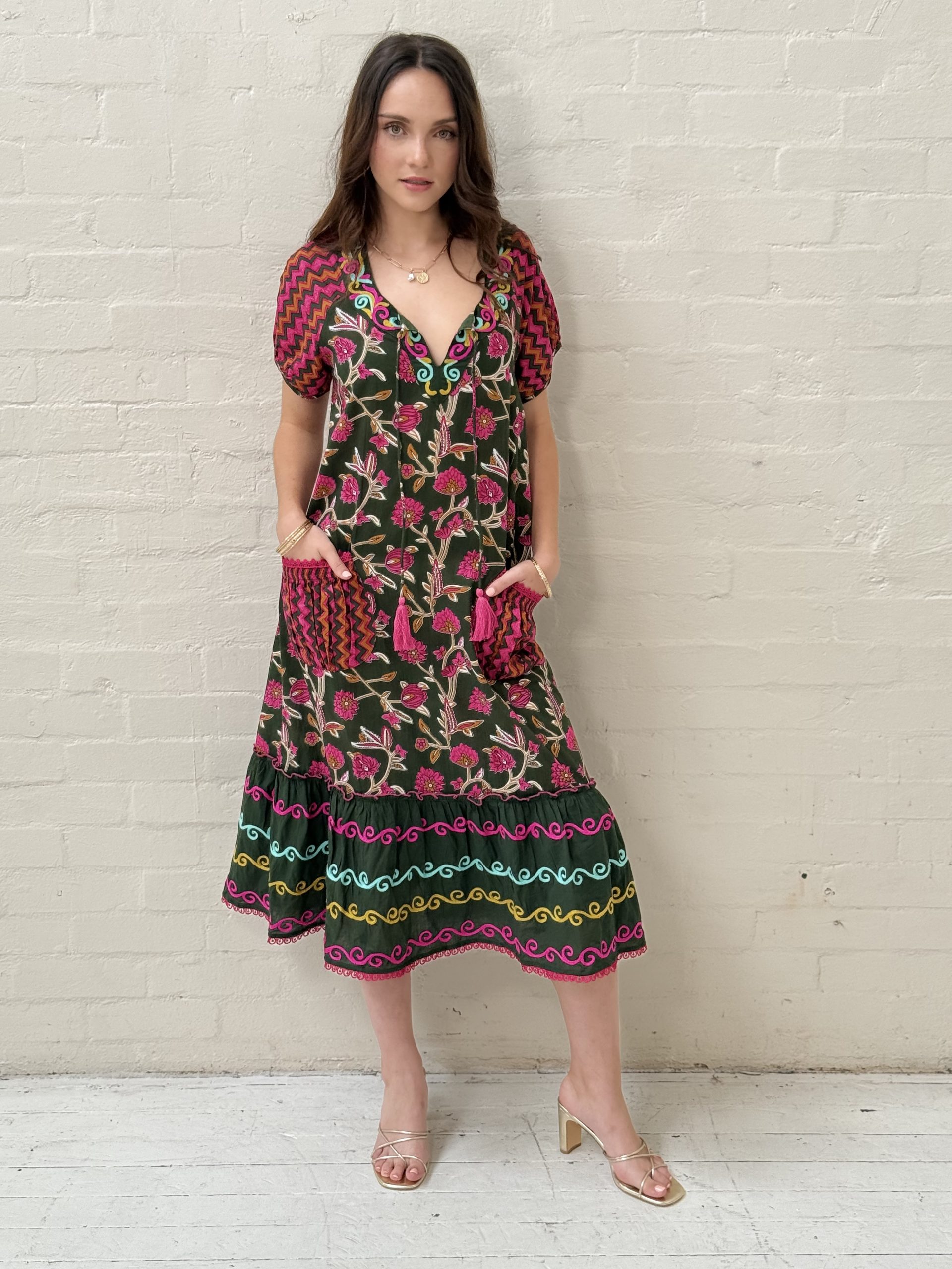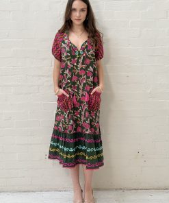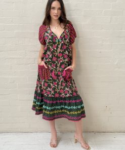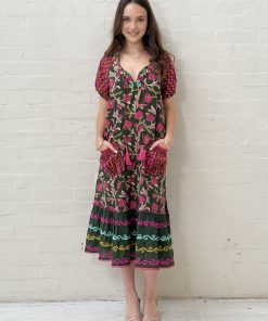 The Sao paulo maxi Dress in the dreamy patch print is a vibrant statement piece, featuring an eclectic mix of bold patterns and playful colour contrasts. Its relaxed silhouette and signature boho details make it perfect for sunny days and effortless styling. This dress is ideal for those seeking a unique and joyful addition to their wardrobe.