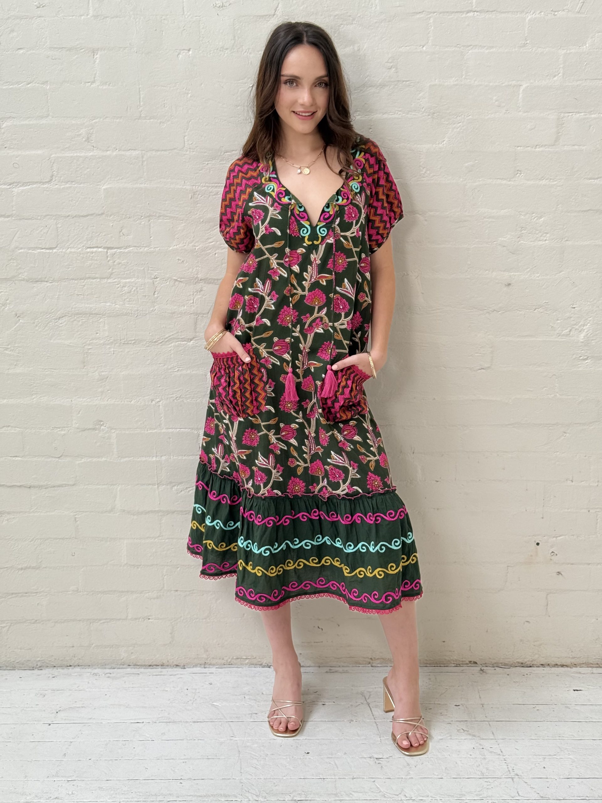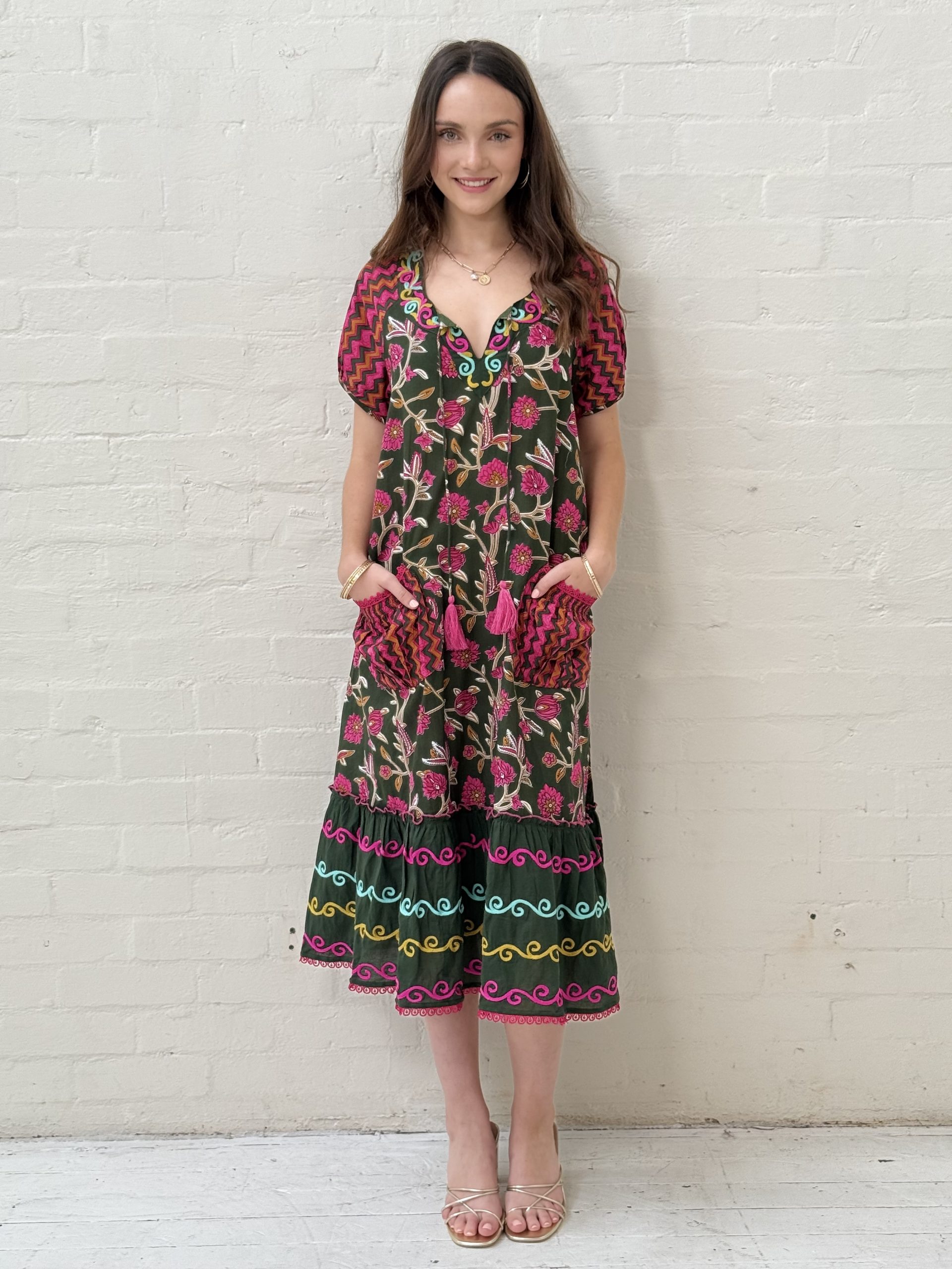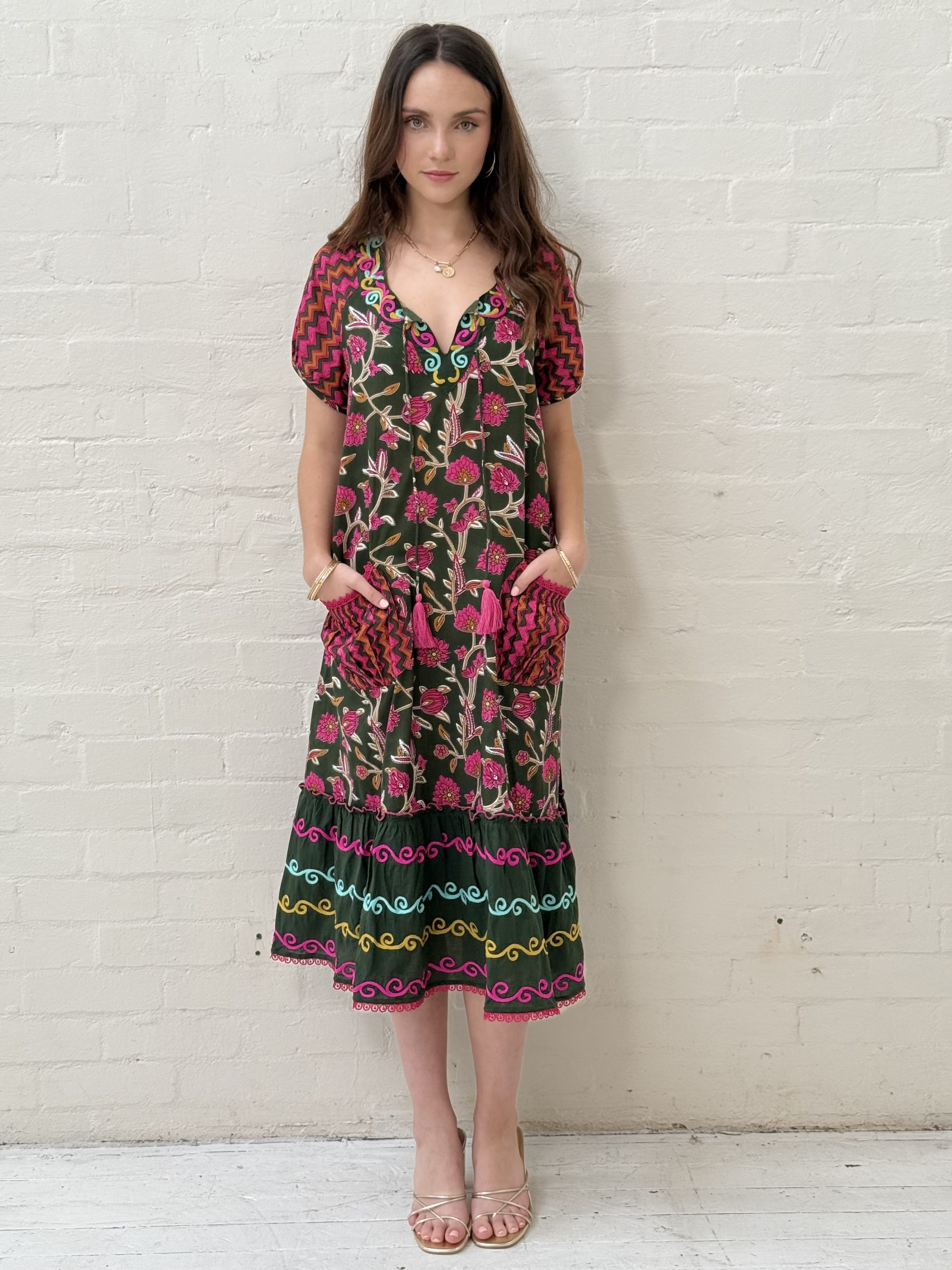 The Sao paulo maxi Dress in the dreamy patch print is a vibrant statement piece, featuring an eclectic mix of bold patterns and playful colour contrasts. Its relaxed silhouette and signature boho details make it perfect for sunny days and effortless styling. This dress is ideal for those seeking a unique and joyful addition to their wardrobe.
