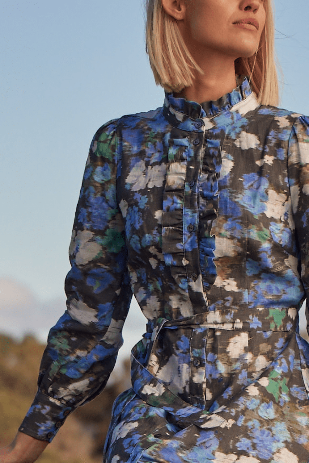 neckline, front and rear darts, and a self-tie belt. Its linen midi-length skirt and voluminous full-length sleeves are a nod to classic design codes, perfect for the season ahead.