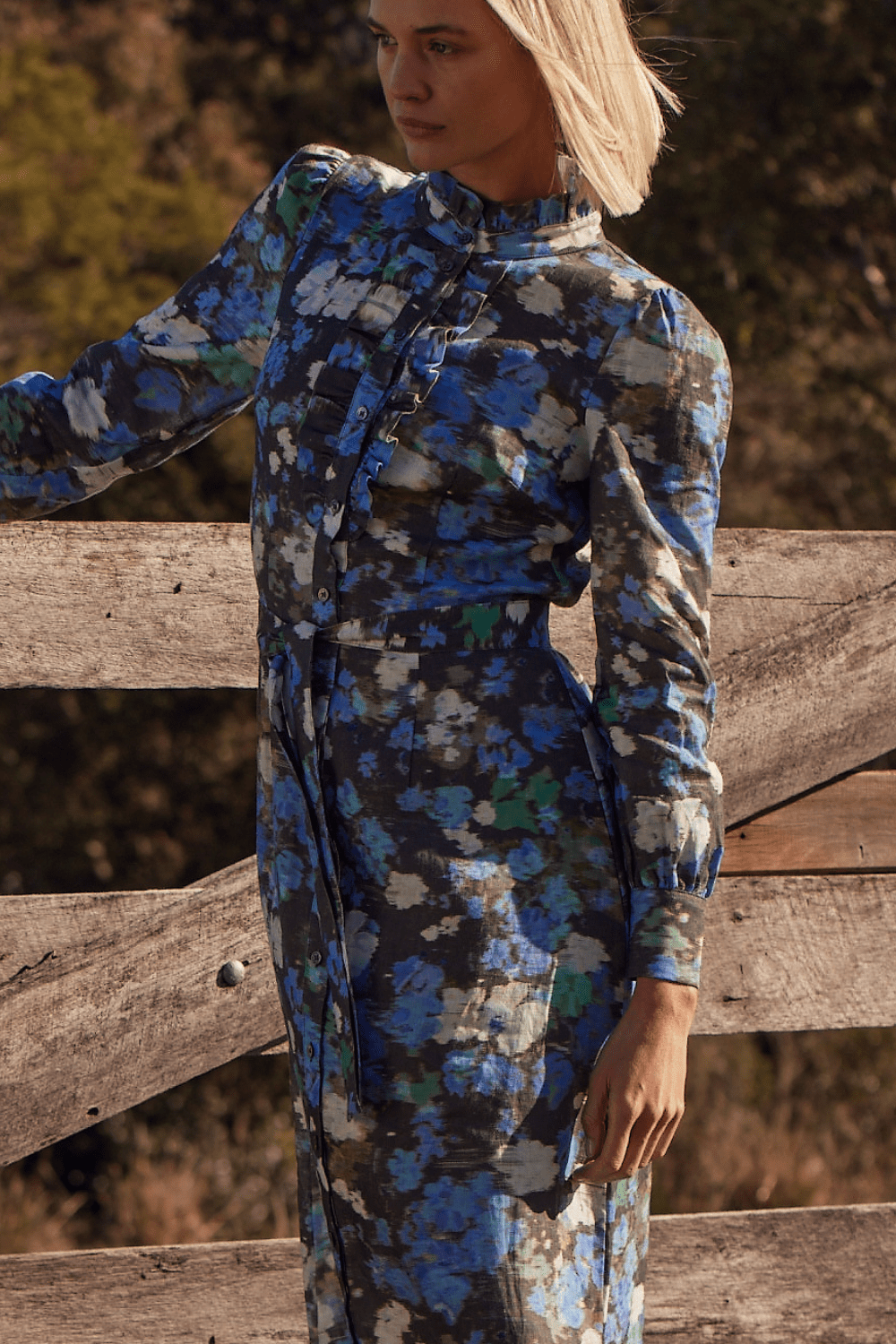 Midi length with ruffled neckline.