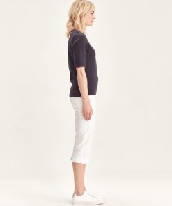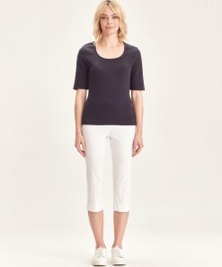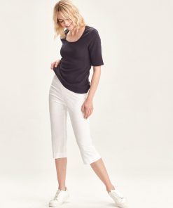 Vertical seam detail at front leg. Concealed elasticised waistband. 3/4 length. Made in our exclusive lightweight European fabric.