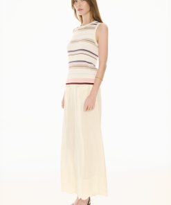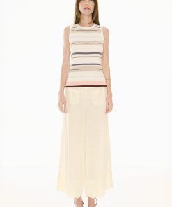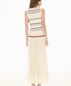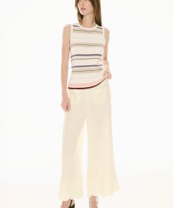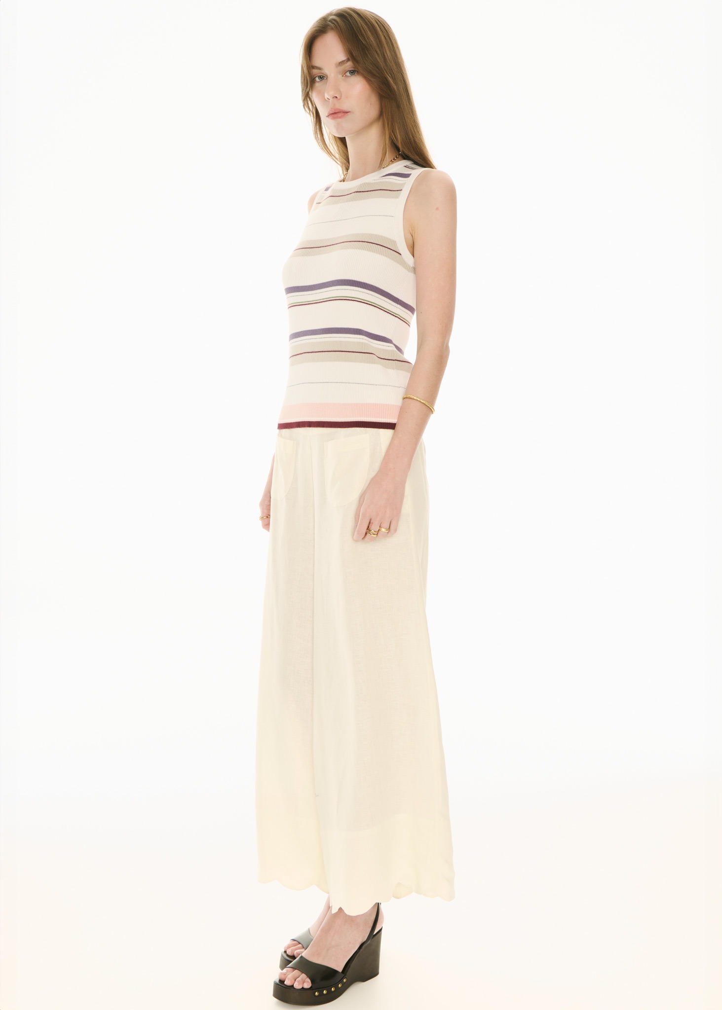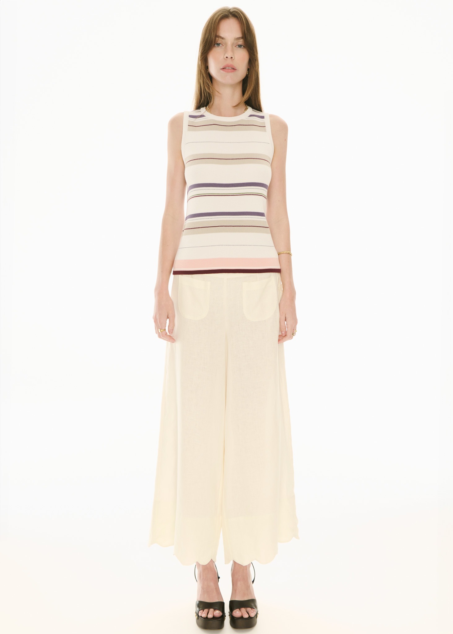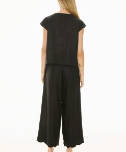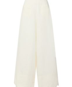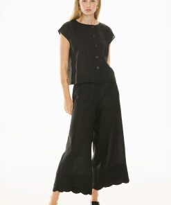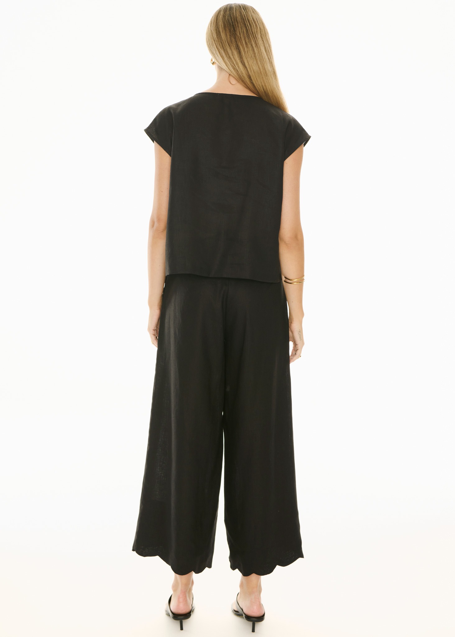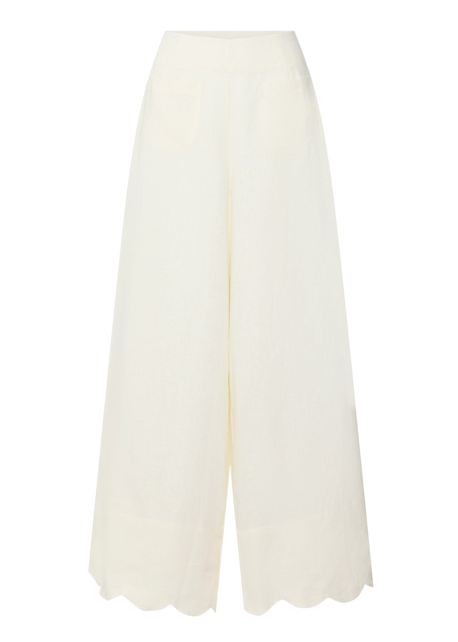 100% Linen trouser Scalloped hem Side button opening Wide leg Front pockets