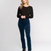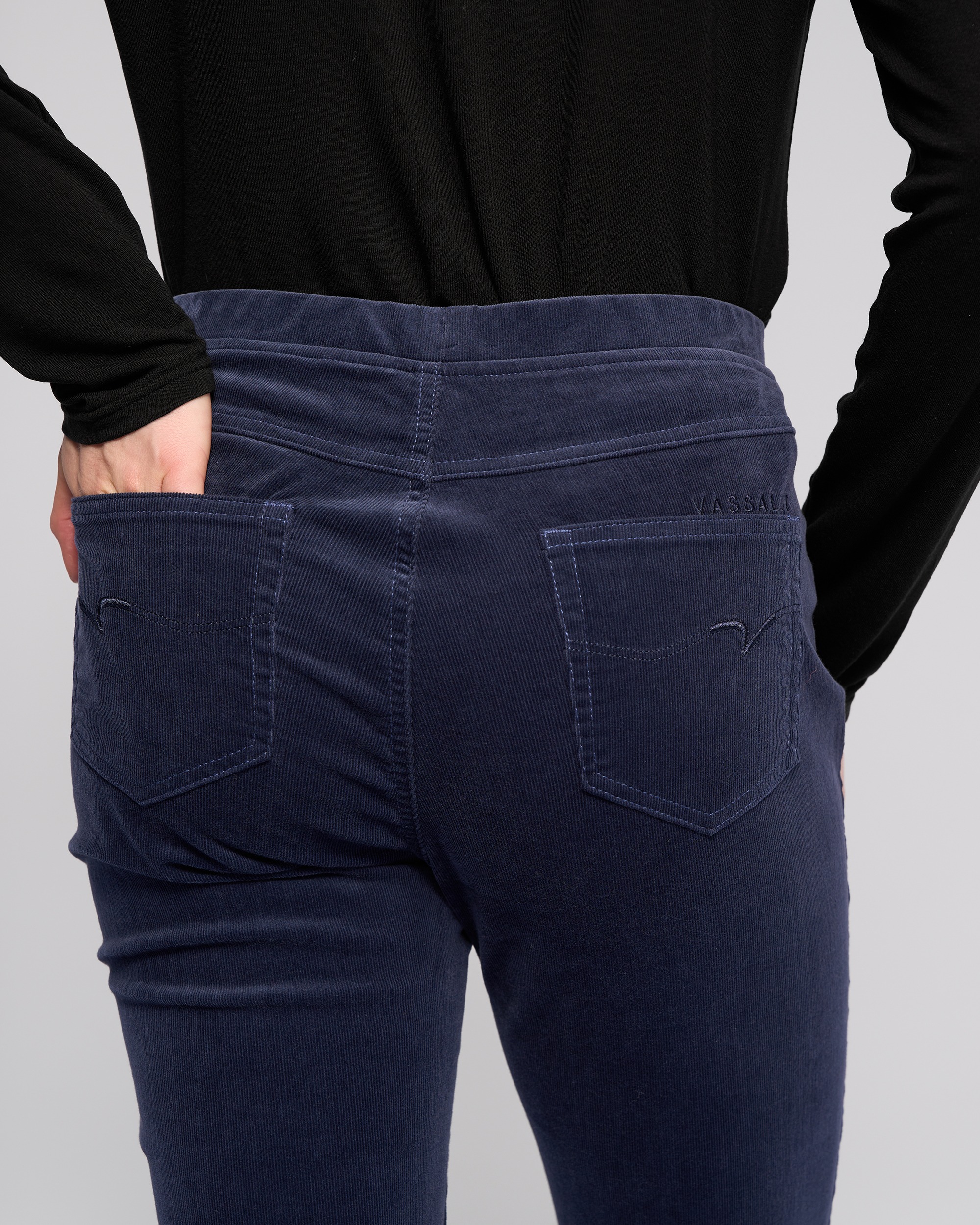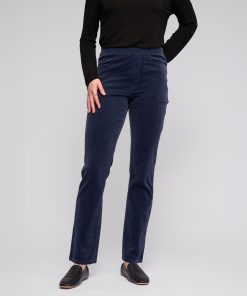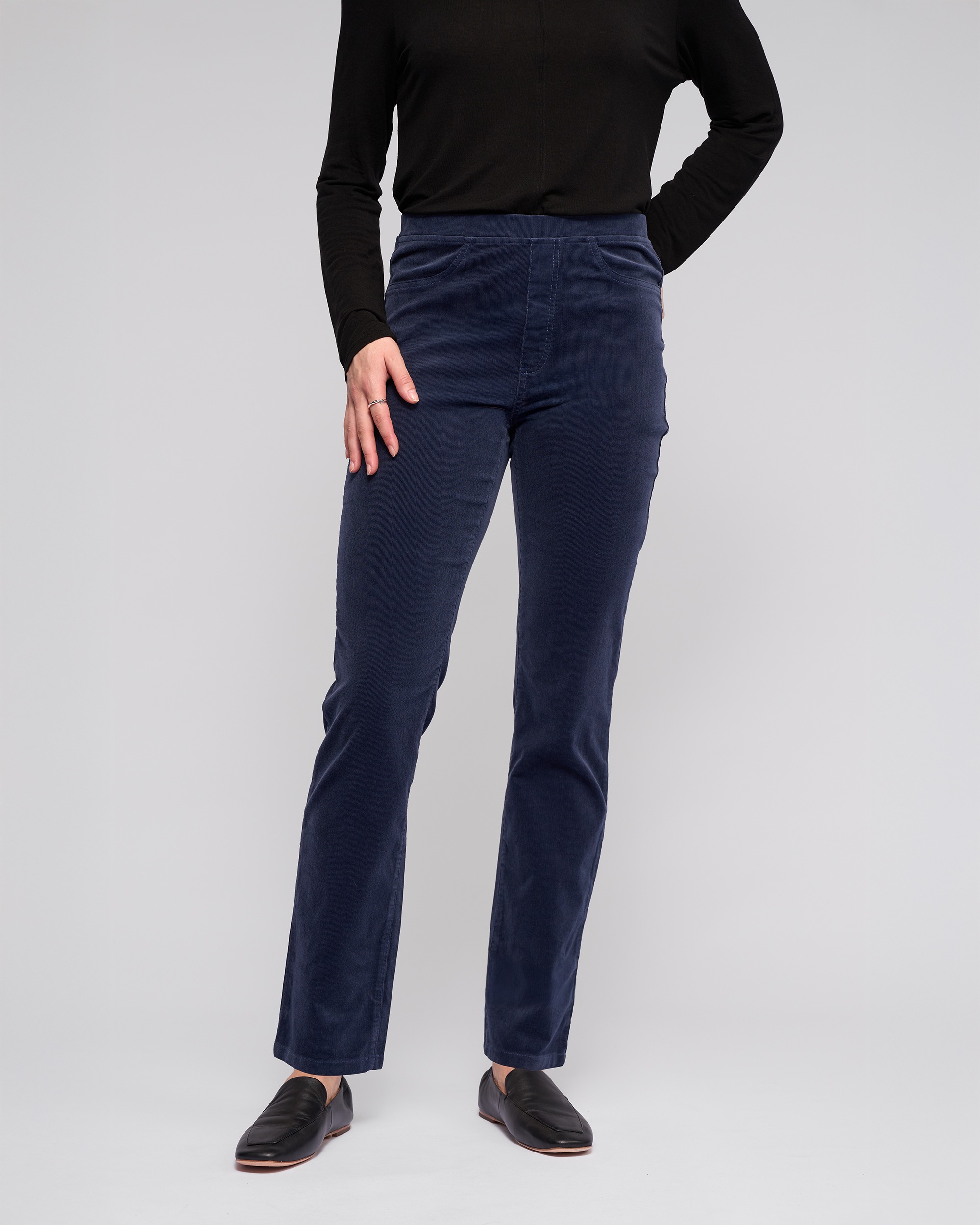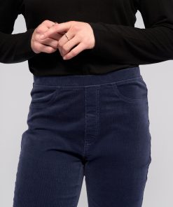 Full-length slim pant in a soft stretch pinwale cord, designed in our Slate colour — a deep, versatile dark blue. With an easy pull-on design and elasticated waistband, this pant creates a smooth, flattering silhouette and includes refined finishing touches like a faux fly, faux front pockets, and back patch pockets.