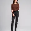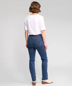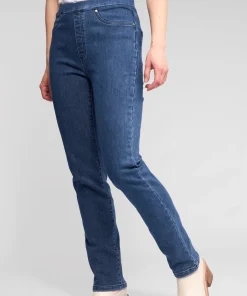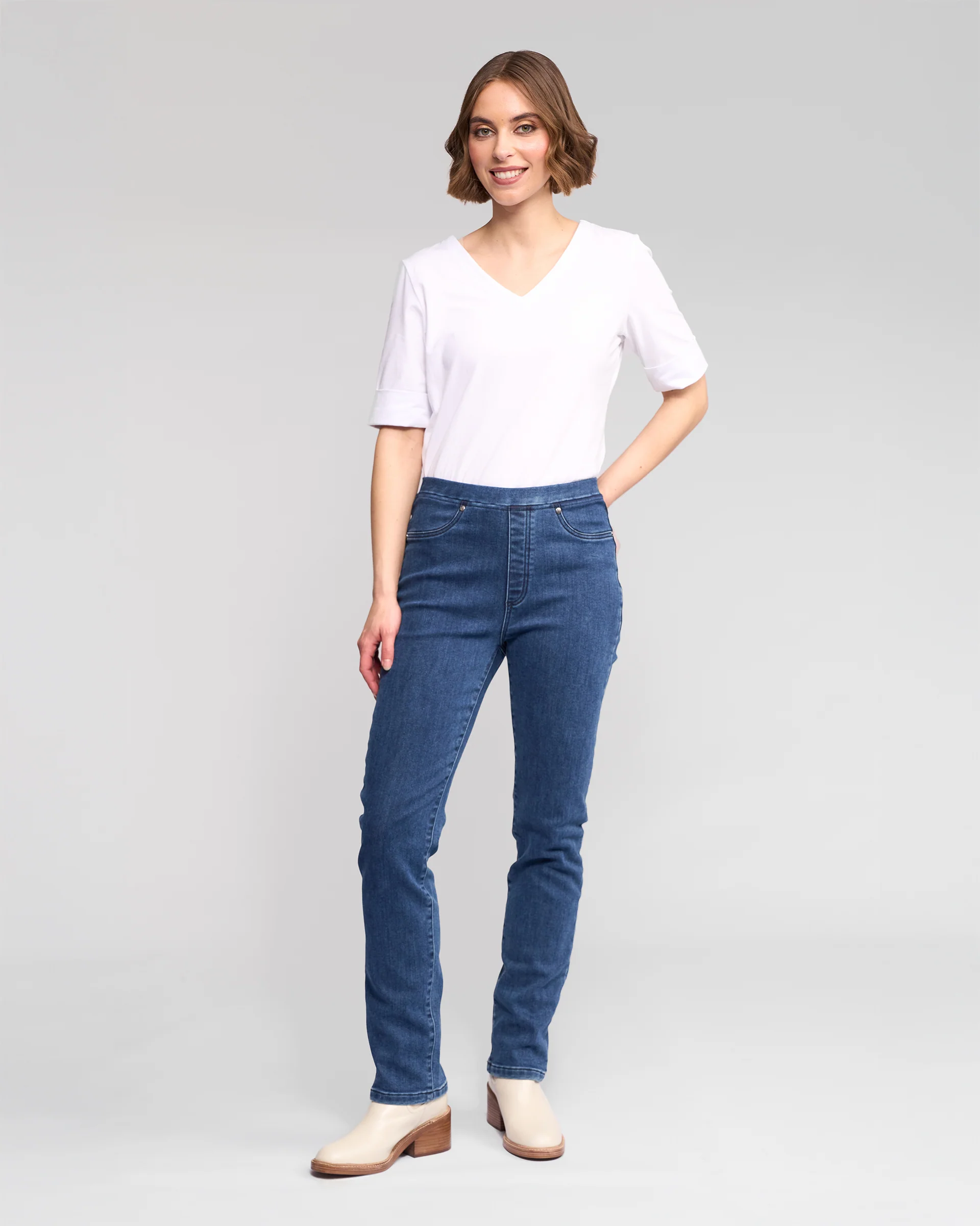Full-length slim pant in stretch denim with a softly brushed inner for added warmth and comfort. Designed as an effortless pull-on style with an elasticated waistband, this pant creates a smooth, flattering fit and features refined denim-inspired details including a faux fly, faux front pockets, and back patch pockets.
