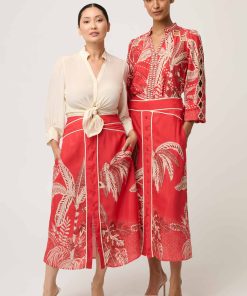 Make a striking statement with the Harper Viscose Faille Print Criss Cross Waist Panel Skirt in Crimson Palms, a refined blend of bold print and elegant tailoring.