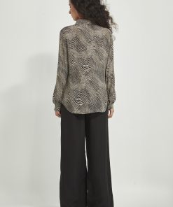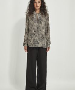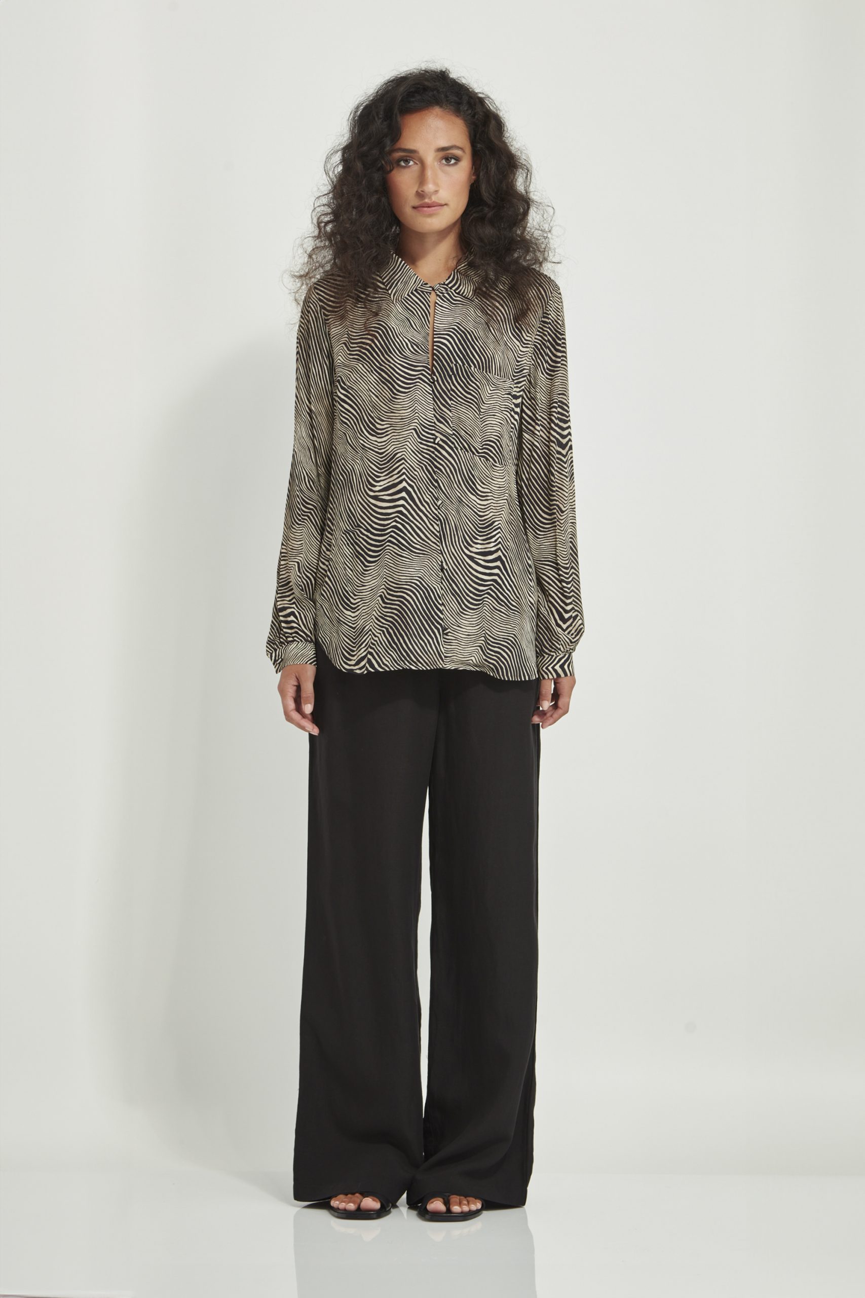 The Rhodes Shirt offers a polished take on modern print dressing. Crafted in a luxurious silk-touch viscose, it moves beautifully on the body and feels soft against the skin. The shirt features Verge’s exclusive abstract wave print—a sophisticated reimagining of animal-inspired patterning—designed to stand out with subtle elegance. A classic shirt collar leads into a softly curved V neckline with button placket, while the front patch pocket adds a casual touch. Full-length sleeves are finished with gathered cuffs and button detailing for added refinement. Gently shaped through the body with a curved hem that skims the hip, the fit is relaxed yet flattering—perfect for tucking in or wearin
