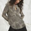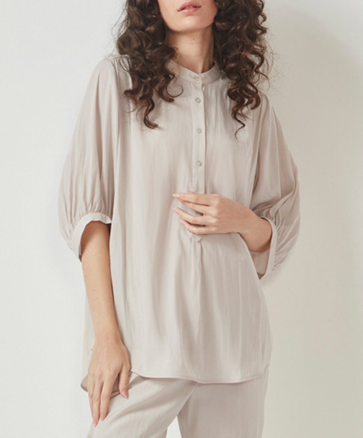The Glide by Verge Rotate Shirt in Champagne is a soft tumbled satin shirt with Mandarin collar and button front placket. Elbow length sleeve with half elasticated cuff. The Glide Rotate Shirt falls just below the hip. Also available in Periwinkle, Midnight and Blue Print options.