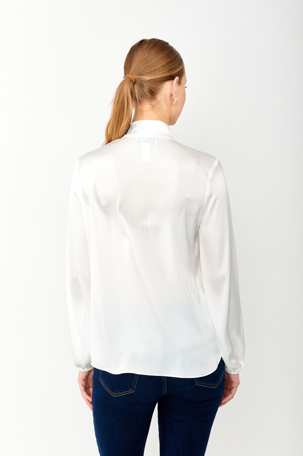 The peak of immaculate style, this beautiful satin top effortlessly elevates any attire. The raised collar, embellished with a keyhole at the shoulder yoke, ties into a flowing bow for a touch of elegance. The long puffed sleeves paired with the shirttail hemline compliment the top’s boxy silhouette and infuse a dramatic flair into this exquisite modern garment.