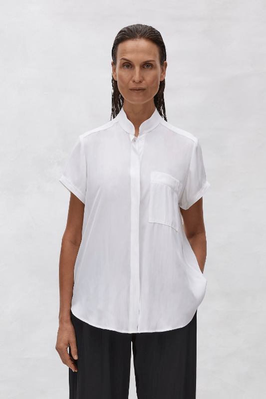 Cut from Mela Purdie’s luxurious Mache fabrication, the Stand Shirt features a petite stand collar and button placketing through the front. A classic wardobe staple.
