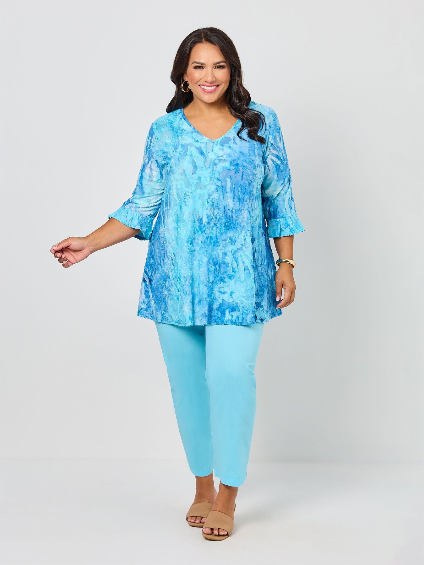 Detail: Straight hem, flattering V- neck, A-line swing, mid forearm sleeves with small frill, blue and white print, stretch burnout knit