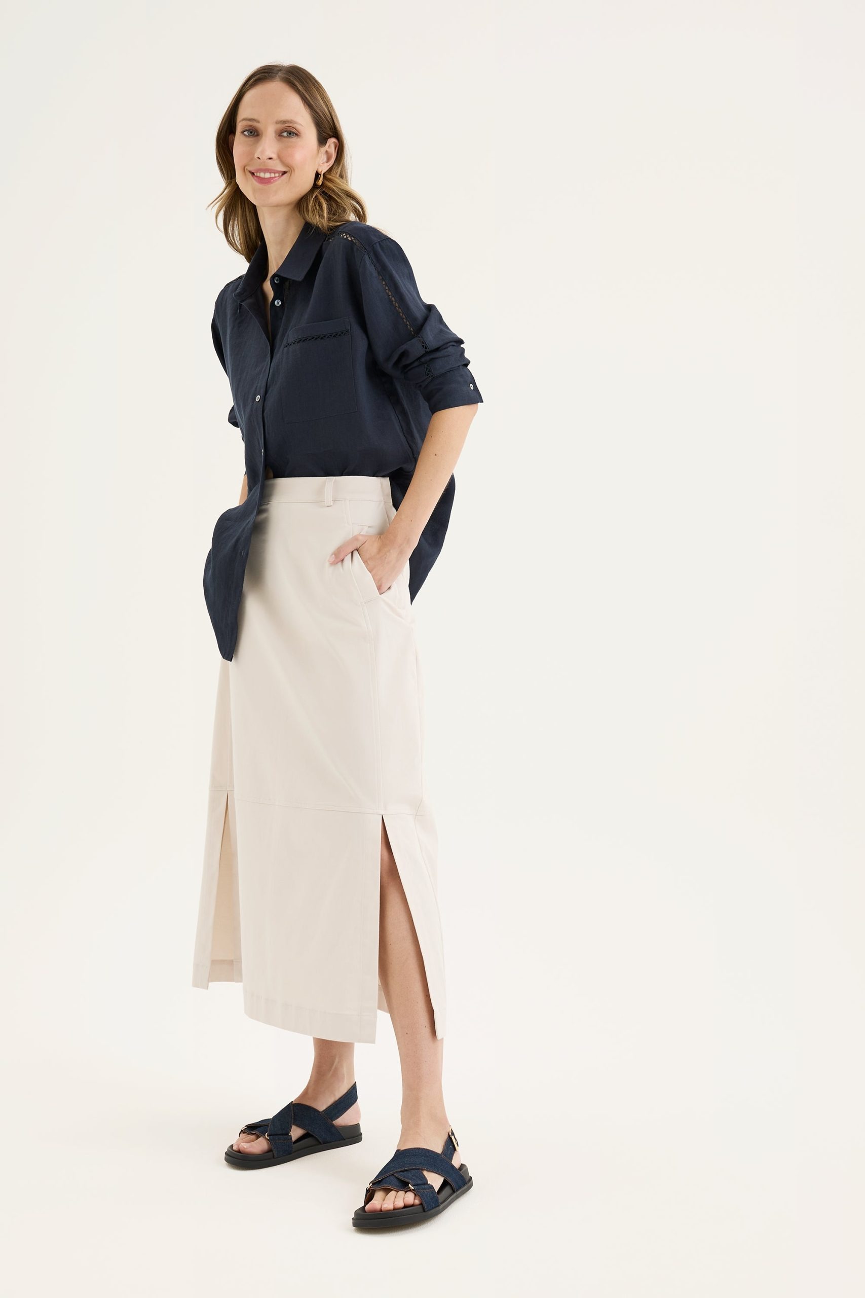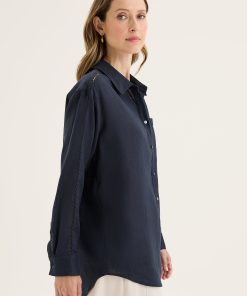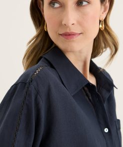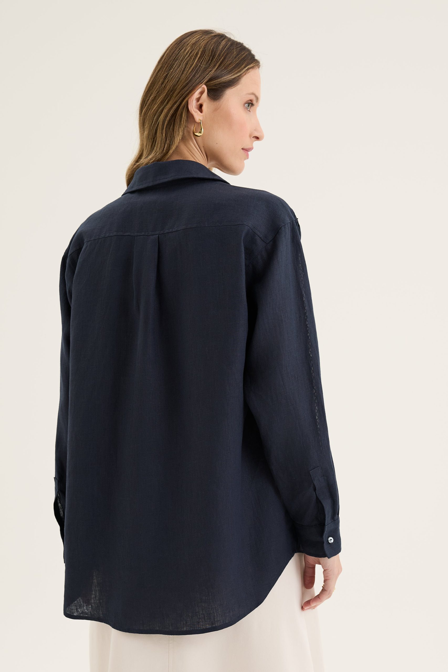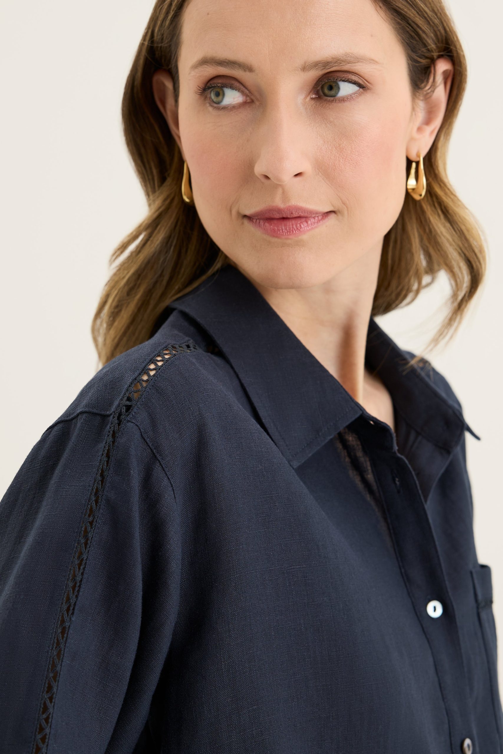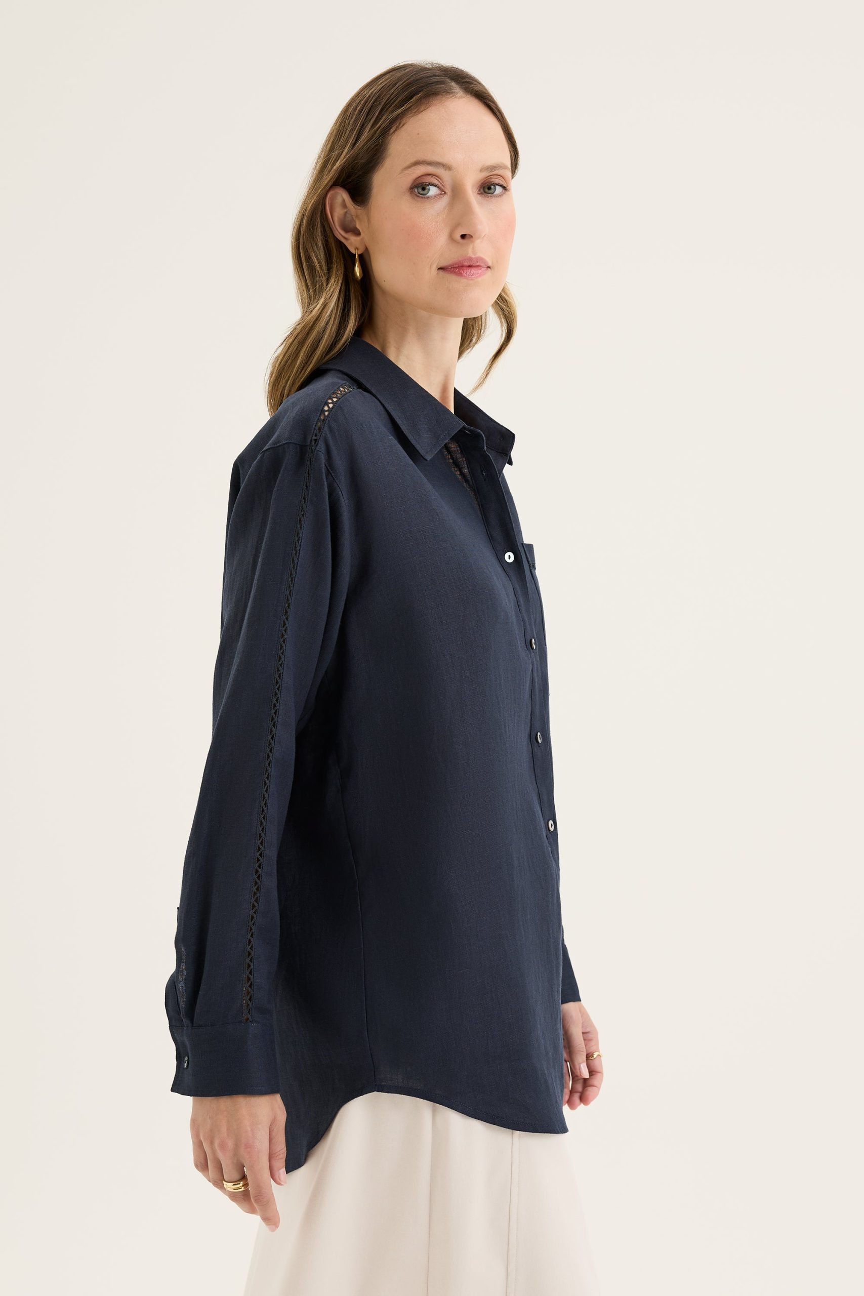 The Tirari Shirt is a refined take on the everyday linen shirt, crafted from 100% European Flax – a premium linen selected for its superior comfort, durability, and breathability. The shirt’s relaxed fit is shaped by timeless details: a classic shirt collar, a traditional front button closure, and long sleeves finished with cuffs and plackets. Delicate ladder lace trim adorns the sleeves and front patch pocket, adding quiet detail and unique character to the otherwise clean, pared-back design. Finished with a curved hem and shirttail, it’s a wardrobe staple that feels effortless and pairs seamlessly with denim, tailoring or linen separates.