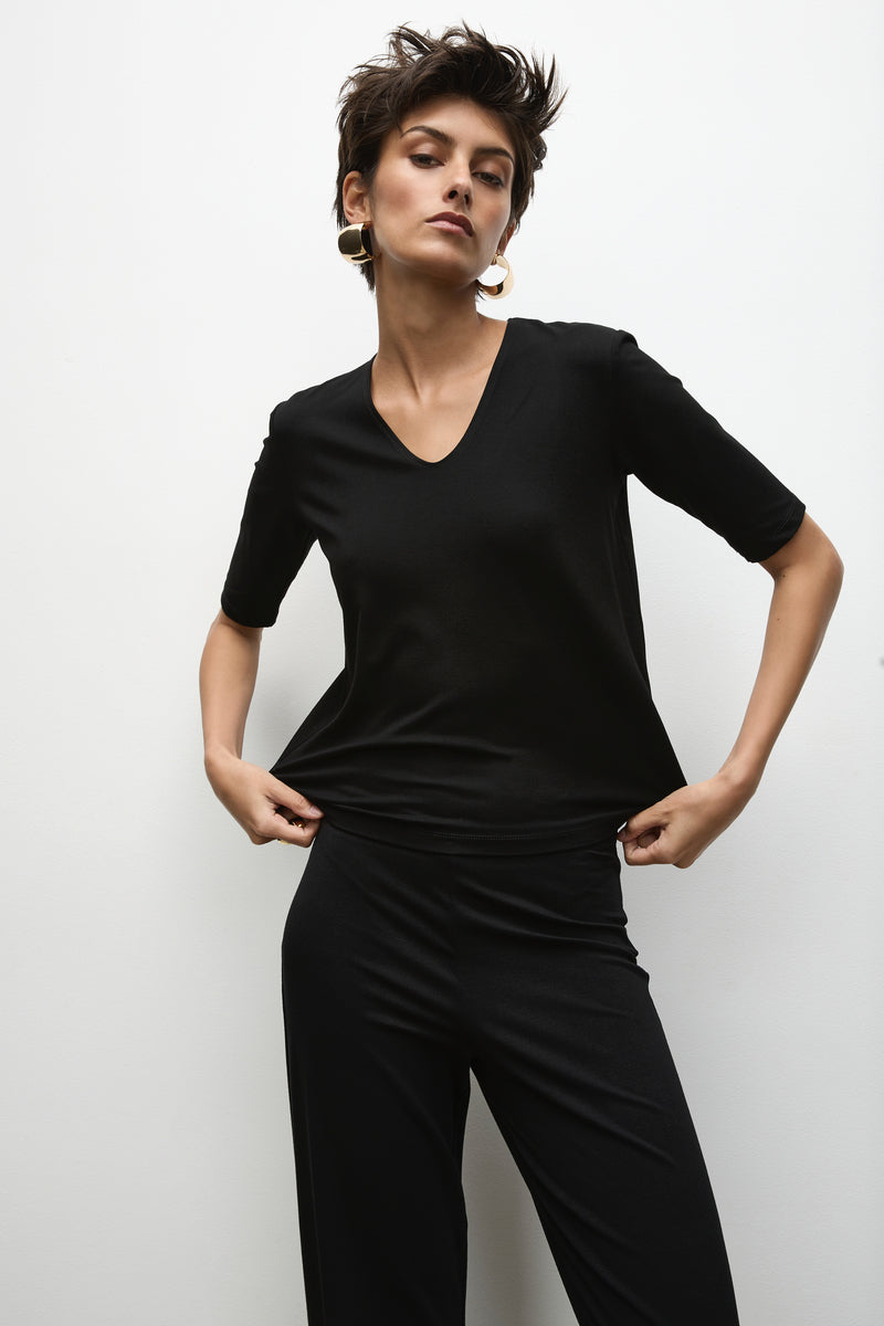 Crafted in Mela’s signature Australian made Matte Jersey and available in this seasons colour palette, this T is an easy-fitting piece, it features a universally flattering V-shaped neckline, squared off hemline and elbow length sleeves.