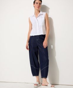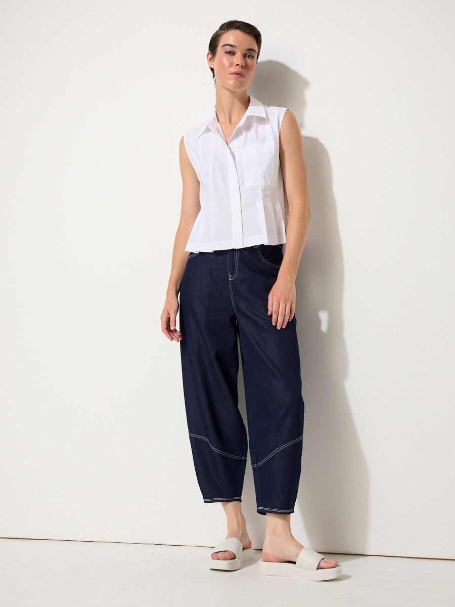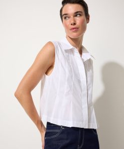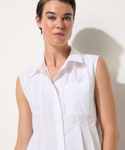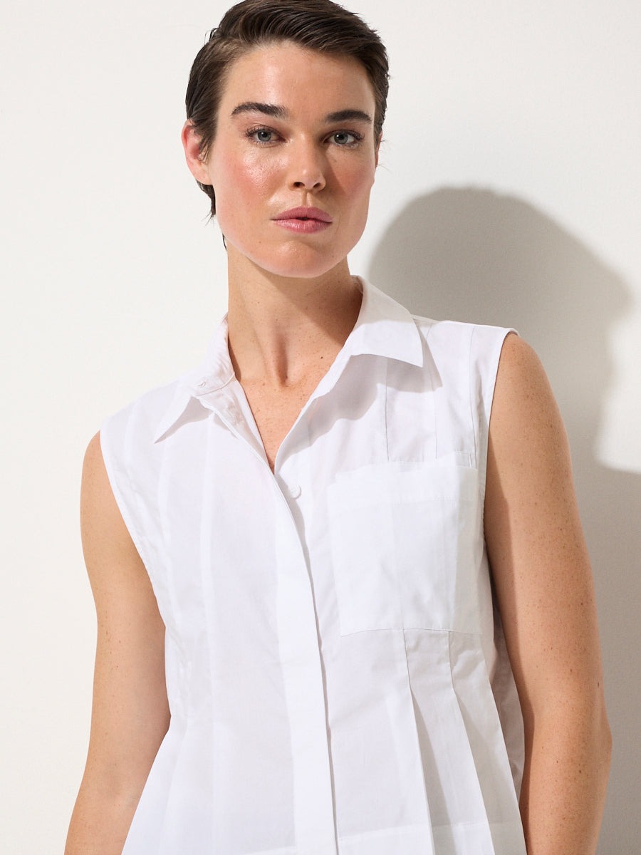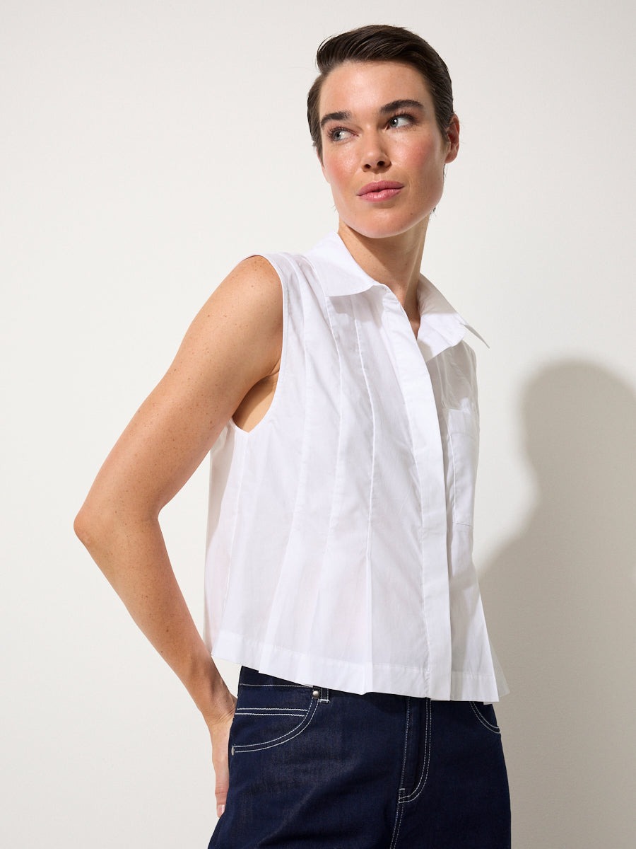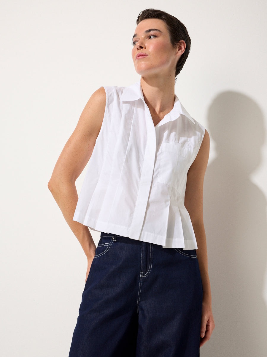 Crisp cotton poplin meets thoughtful design in the Pleated Poplin Shirt. This sleeveless style features a structured shirt collar and concealed buttons for a polished finish, while sliced pleats through the front add a fitted shape around the waist. A single chest pocket brings a touch of ease, balancing the tailored waist-length cut. Crafted from 100% cotton, it’s lightweight yet structured – the kind of summer staple that feels effortlessly refined whether paired with denim or styled back to matching poplin separates.