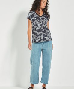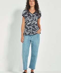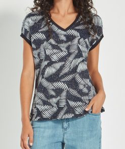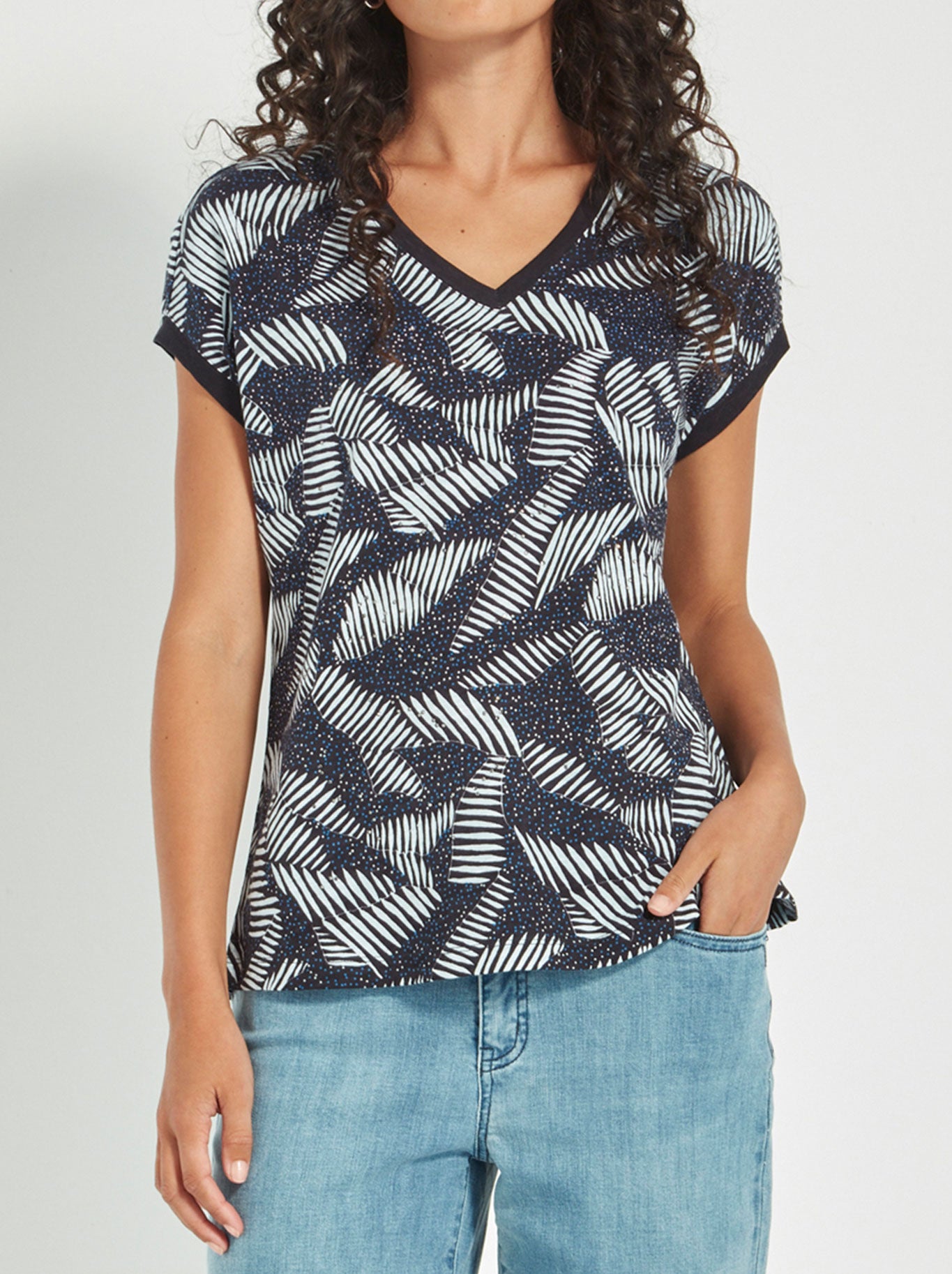 Modern and fresh, the Suki Top showcases an original Verge print and pairs effortlessly with denim, white, or ink-toned pants. Designed with an extended shoulder flowing into a short sleeve, it features a flattering V-neckline and fully fashioned rib trim at the neck and sleeve hems. The curved hemline softens the silhouette, eliminating a hard line at the hip for a flattering, easy-to-wear shape. A vibrant update to your everyday essentials.