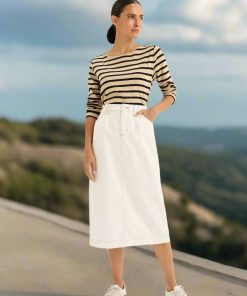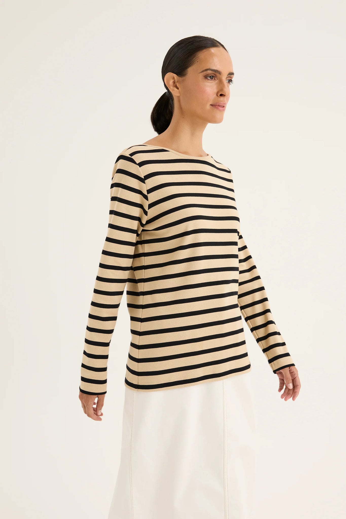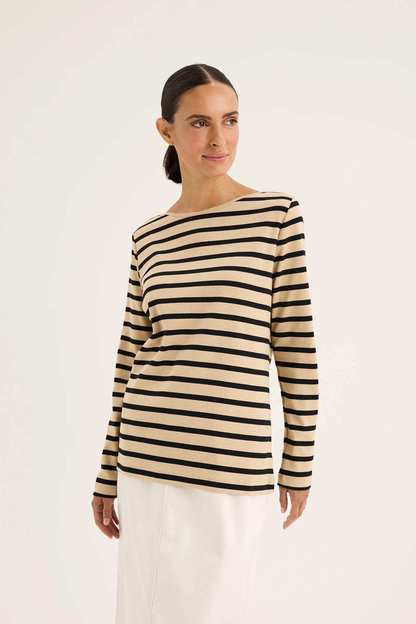 The Boardwalk Tee is an enduring essential, crafted from 100% Cotton for comfort. The tee stands out with its slender stripes, enhancing chic and appealing touch. Boat neckline and long sleeves ensure its sleek and timeless designs. Semi-fitted profile is effortless for a styling and layering option. Pair it with any piece in your wardrobe for an attractive winter look.