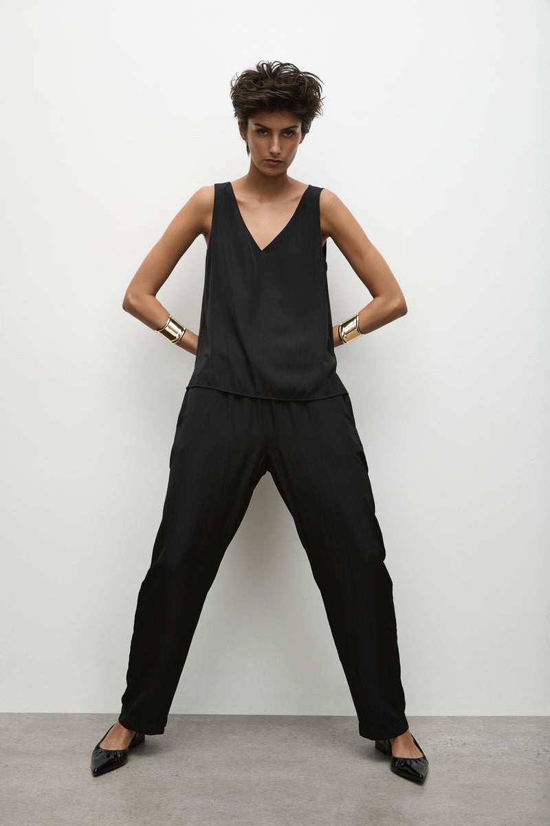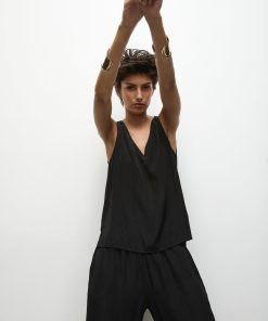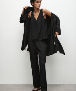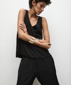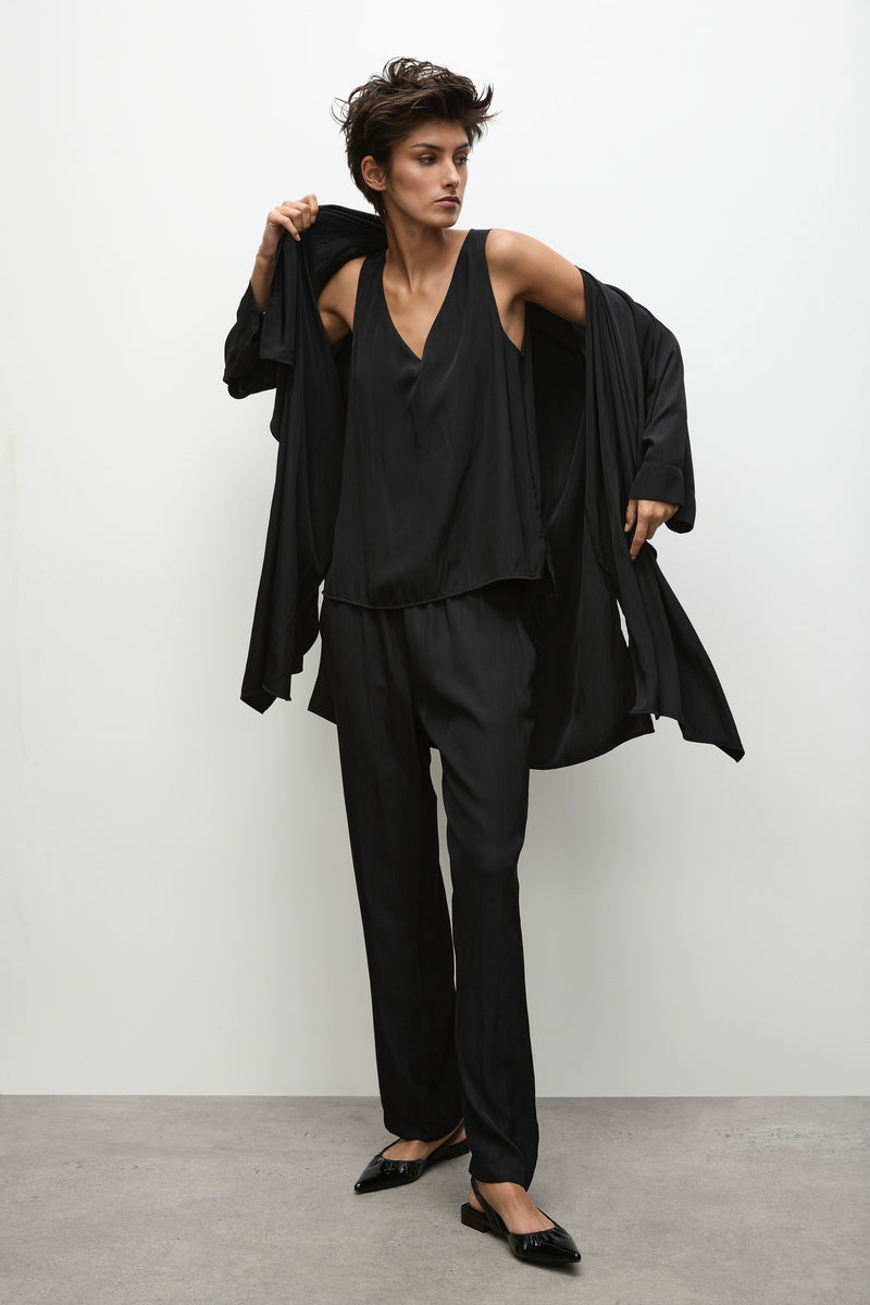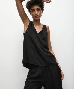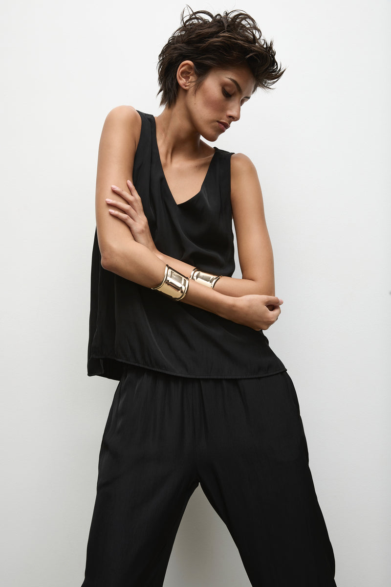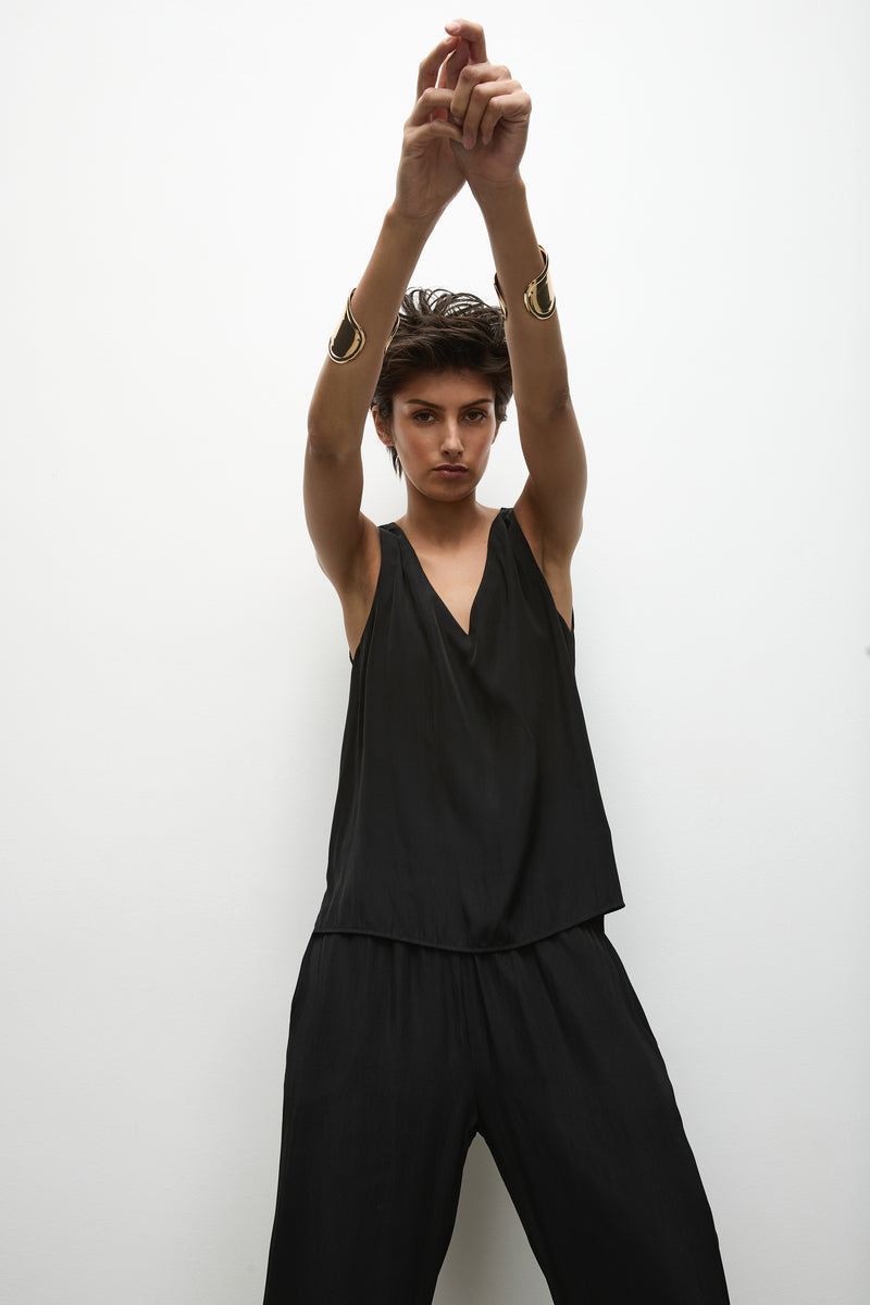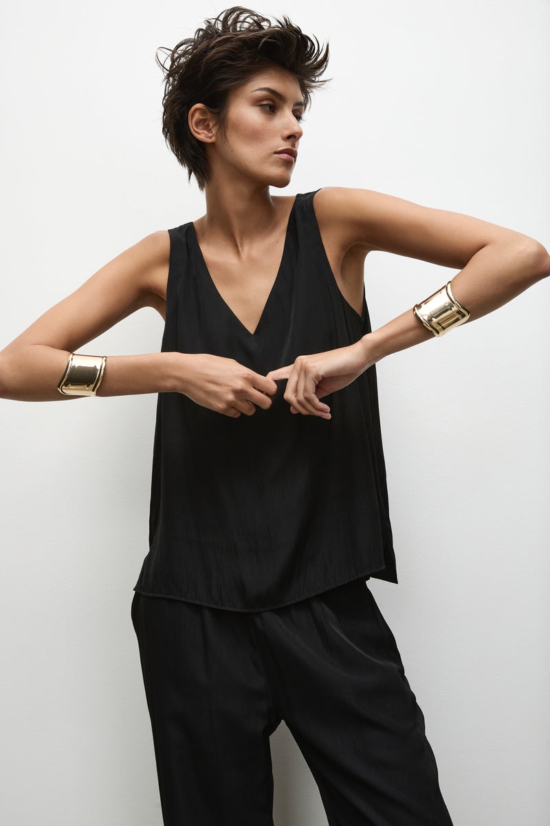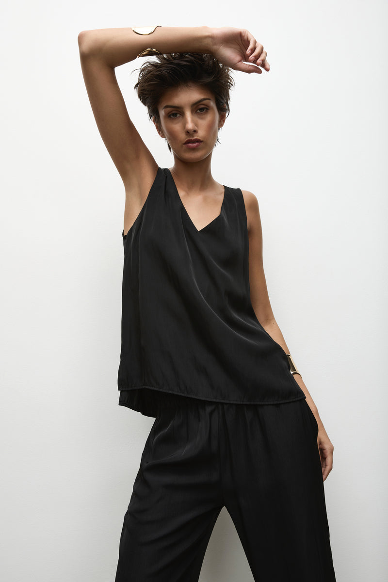 The Audrey Tank in Macro-Mousseline is a Mela Purdie essential with a universally flattering soft v-neckline. The fully covered back features a back pleat for ‘easy’ movement. Worn layered, or on it’s own, the Audrey Tank has a stepped hem for longer length at the back and a double layered front for extra coverage.